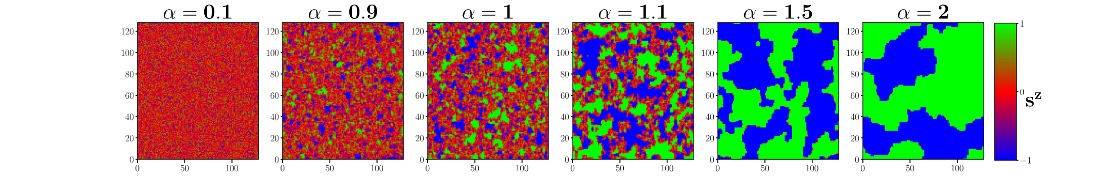 In this work [7, 8], we studied the CDW-SC competition by means of Monte Carlo simulations. We use an anisotropic Heisenberg model on a two-dimensional square lattice that captures the basic symmetries of the problem: the out-of-plane component of the pseudospin sz encodes two possible charge ordered variants (up/down) and the in-plane component stands for the SC order parameter. We construct a phase diagram where the anisotropy term α introduced plays the same role as the magnetic field in real experiments and it can tune the transition from the topological BKT to the CDW (see Fig. 1). Importantly, we find the presence of impurities is necessary in order to stabilize the clustering of polycrystalline charge ordered domains and the appearance of filamentary superconductivity.